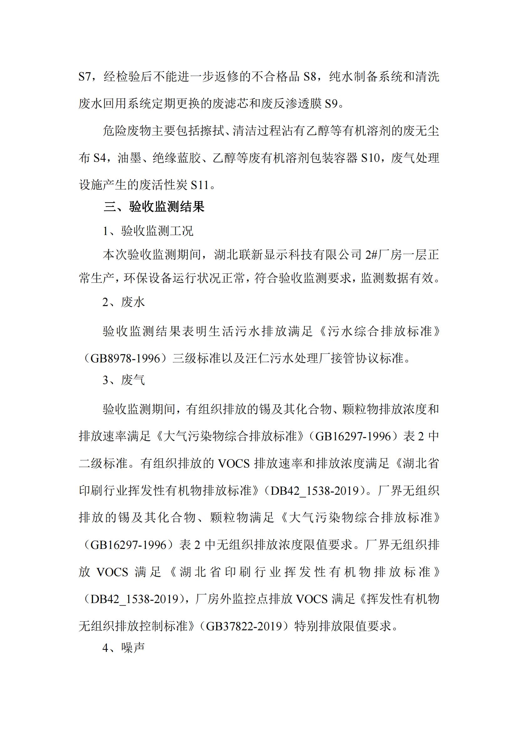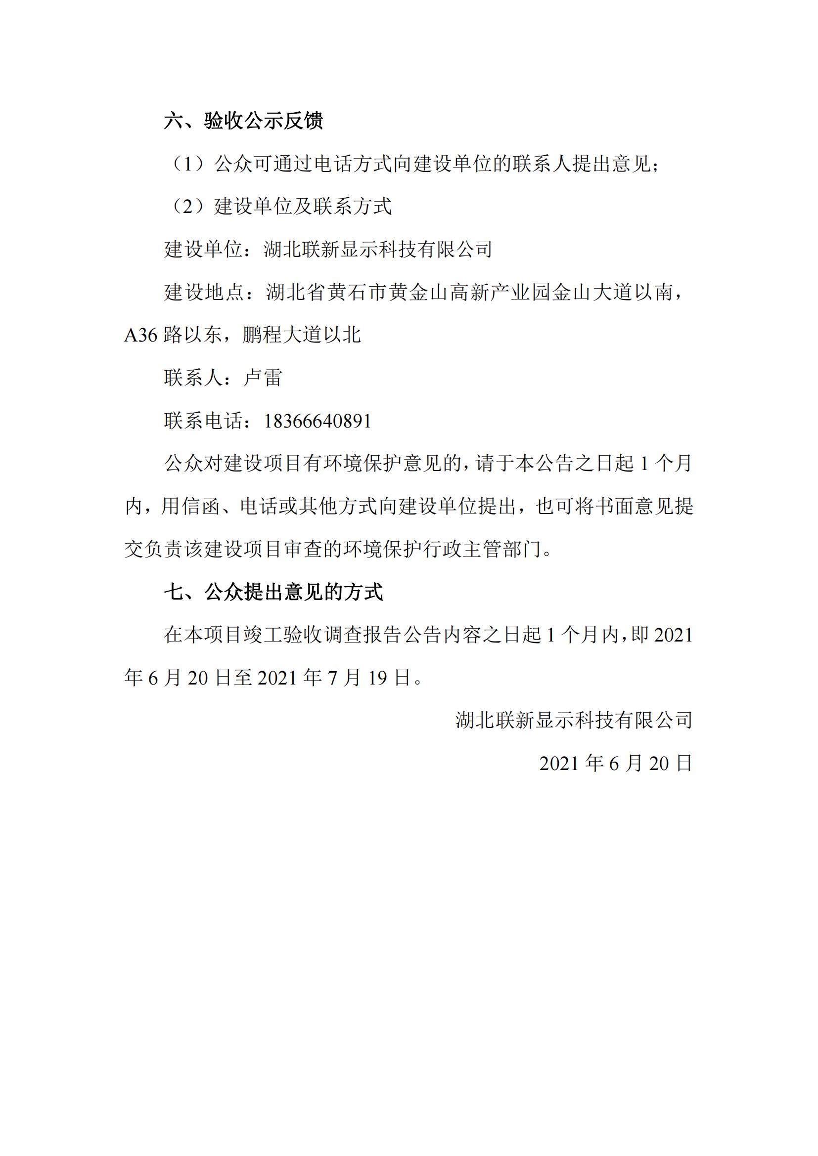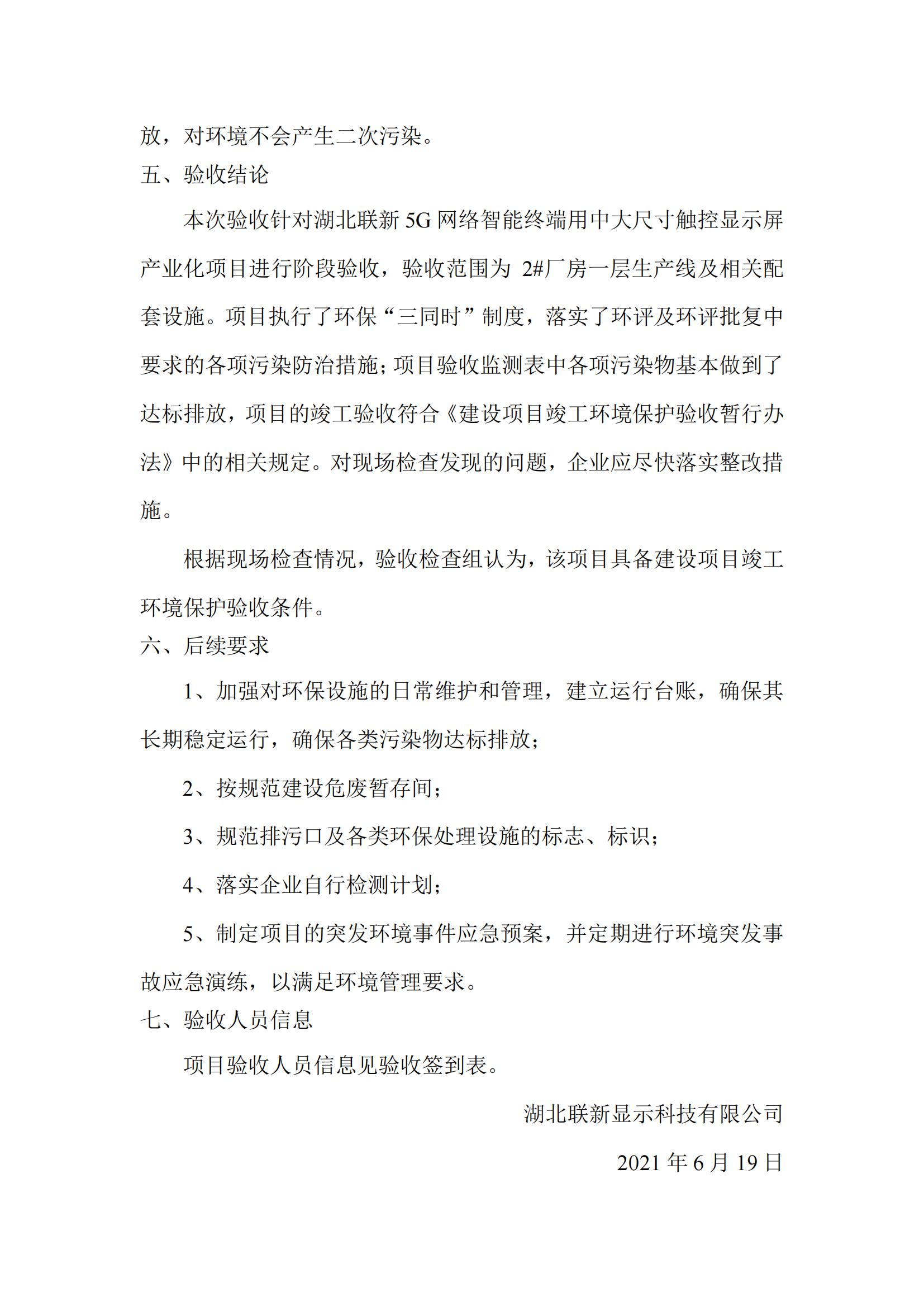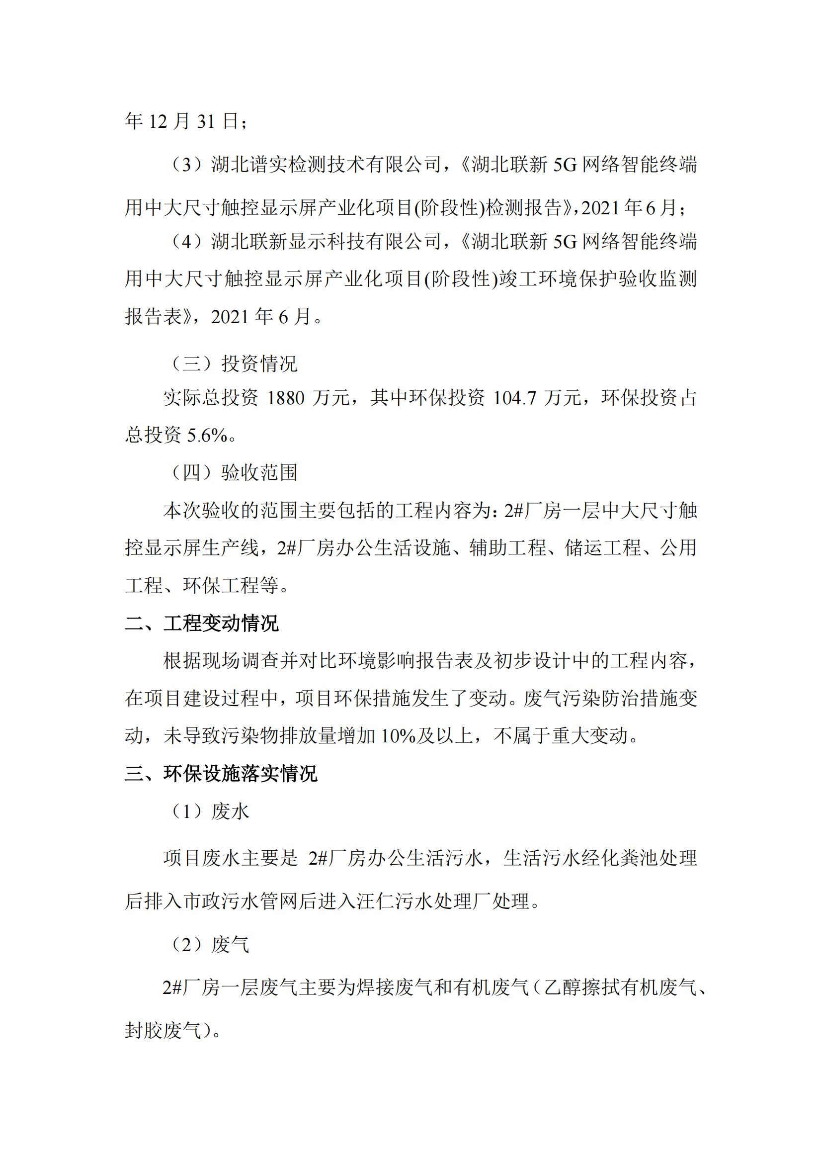 关于湖北联新5G网络智能终端用中大尺寸触控显示屏产业化项目(阶段性)竣工环境保护验收公示