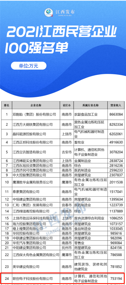 12月13日,2021江西民营企业100强、2021江西制造业民营企业100强、2021江西服务业民营企业20强榜单发布,联创电子以强大的综合实力和稳健的发展态势,连续第九年荣登榜单。其中,在江西民营企业100强中位列第24位,较前一年位次前进3位,在江西制造业民营企业100强中位列第13位。
